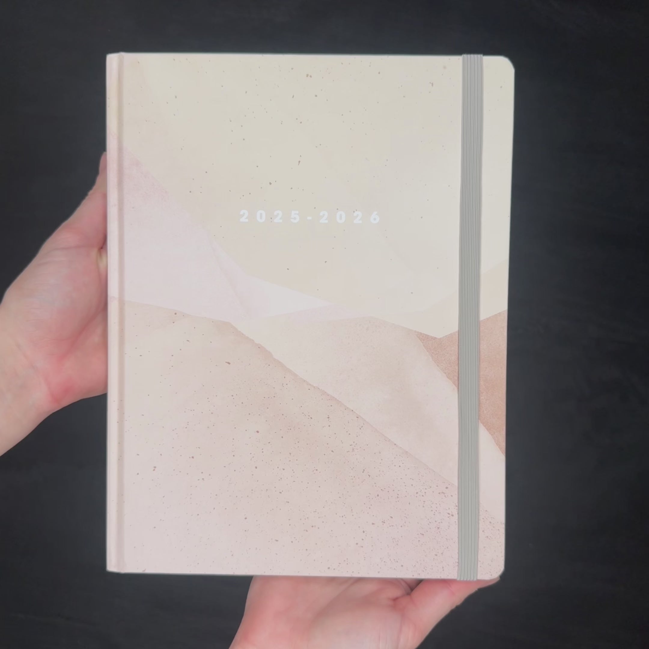 Deze frisse docentenagenda 2025-2025 ±A4 heeft een harde cover, welke is bedrukt met een abstracte achtergrond in zachte oudroze tinten. De jaartallen '2025-2026' zijn in wit op de cover gedrukt.