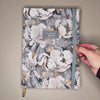 Deze prachtige A4-formaat personeelsplanner heeft een klassiek coverdessin van witte pioenen op een grijsblauwe achtergrond. De harde cover heeft een fijne soft touch afwerking, waardoor deze zacht en premium aanvoelt. Als extra detail is de tekst 'Planner 2026' in glanzende goudfolie op de omslag gedrukt.