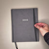 Deze afsprakenagenda agenda 2026 heeft een zwarte lederlook cover voor een stijlvolle, zakelijke uitstraling. Als extra detail is het jaartal 2026 met glanzende zilverfolie op de omslag gedrukt.