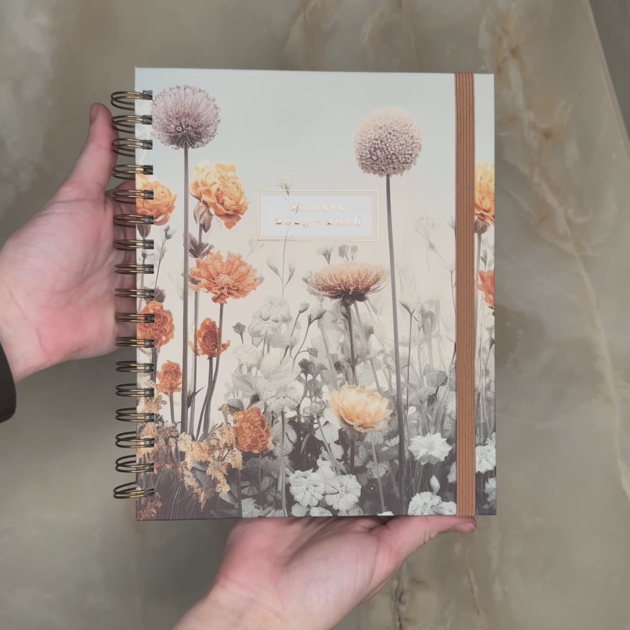 Dieser Wochenplaner 2025–2026 mit kupferfarbenem Ringbuch hat einen festen Einband mit einem schicken Aufdruck von Wildblumen in Orange- und Cremefarben. Der Text „Planer 2025–2026“ ist in Goldfolie auf den Umschlag gedruckt.